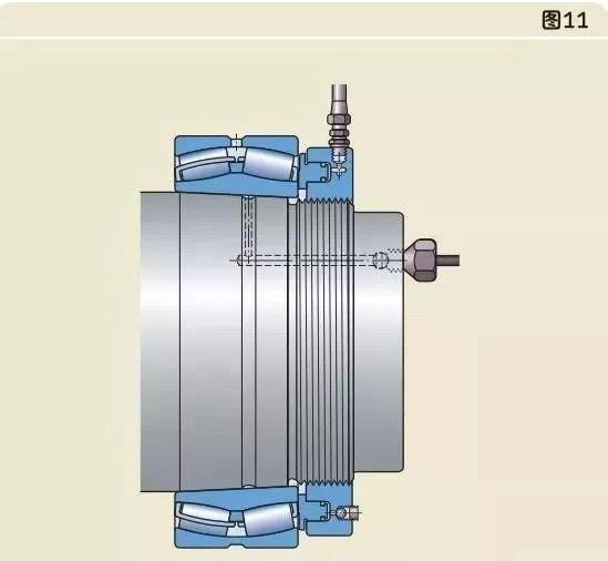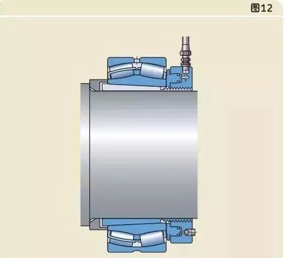 注油法的工作原理是:液壓油在高壓下通過油孔和油槽,注入軸承和軸徑之間的配合面,形成一層油膜。油膜將配合面分開,使得配合面之間的摩擦大幅減少。這種方法通常用于直接把軸承安裝在圓錐形軸徑上的情況。必須的油孔和油槽應(yīng)是整體軸設(shè)計的一部分。如果緊定套和退卸套,已加工有油孔油槽,這種方法也可用于將軸承安裝在緊定套或退卸套上。